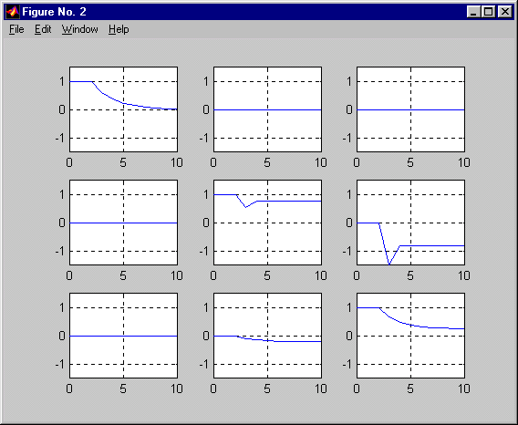 Matlab produces the plot of Fig. 2 for the impulse response matrix. The step responses may be computed similarly and are shown in Fig. 3.